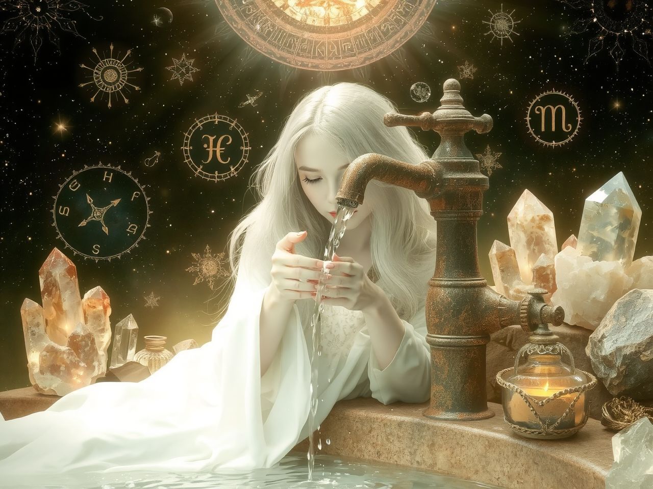 A víz az élet esszenciája, az érzelmek, a tudat és a megtisztulás univerzális szimbóluma. A pszichológiában és az ezotériában egyaránt a folyékonyságot, az alkalmazkodóképességet és az áramlást jelképezi. Amikor a víz tiszta és friss, az érzelmi egészséget, a belső békét és a gondolatok akadálytalan áramlását jelzi. A csap, mint a forrás és a fogyasztó közötti átjáró, a tudatos hozzáférést jelenti a belső erőforrásainkhoz.