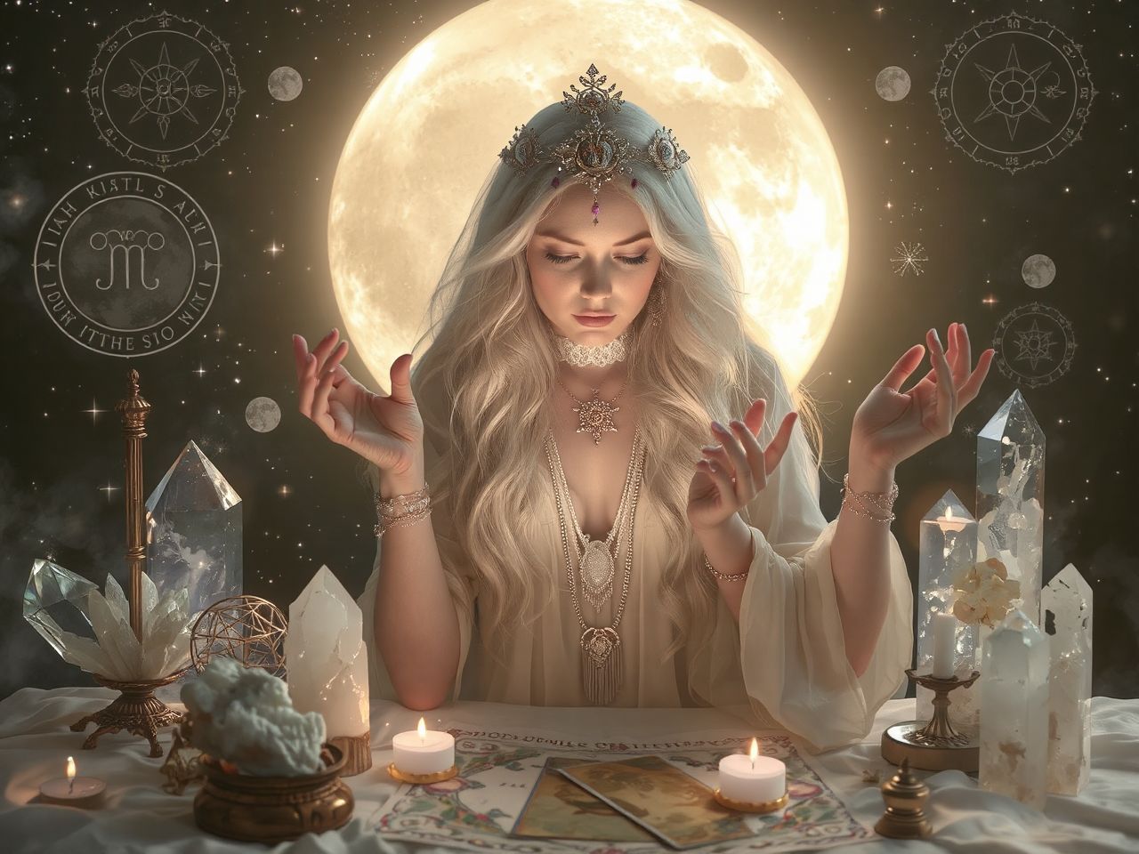 - Hold szimbólumok: Ezüst tárgyak, Hold-medál, vagy egy tál víz, amely tükrözi a Hold fényét.